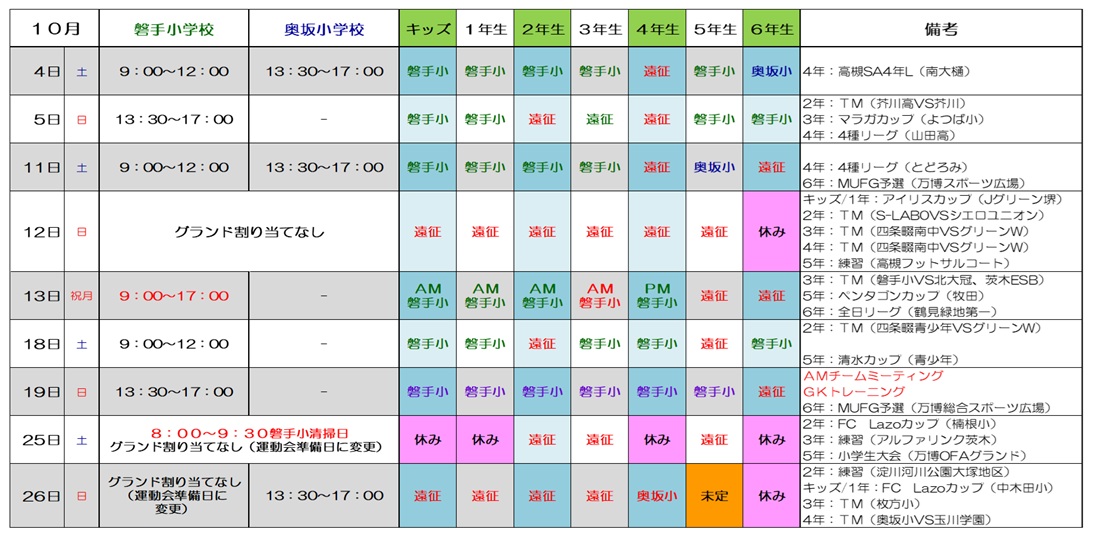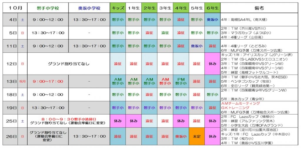 10月度練習(グランド)予定表