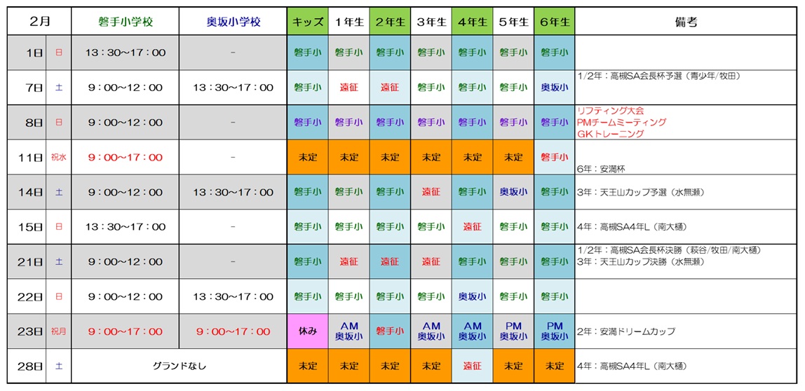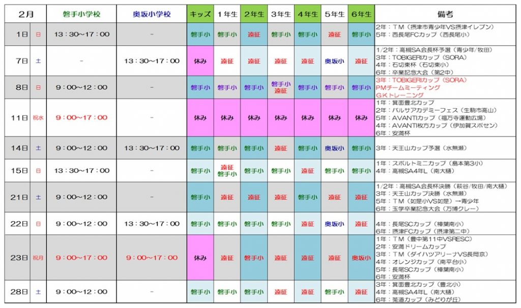 ◆注意事項◆【学校への入校時間】◇磐手小学校◇【AM】 8:30以降に入校可能【PM】13:00以降に入校可能◇奥坂小学校◇【AM】 8:30以降に入校可能【PM】13:00以降に入校可能【学校からの退校時間】◇磐手/奥坂小学校◇ 12:00練習終了⇒12:30までに完全退校 17:00練習終了⇒17:30までに完全退校
