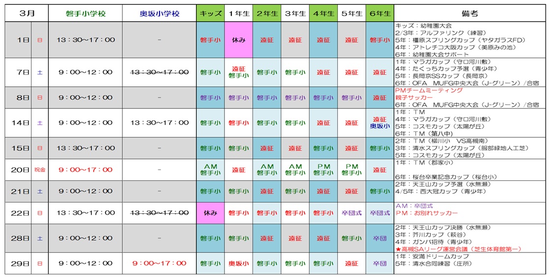◆注意事項◆【学校への入校時間】◇磐手小学校◇【AM】 8:30以降に入校可能【PM】13:00以降に入校可能◇奥坂小学校◇【AM】 8:30以降に入校可能【PM】13:00以降に入校可能【学校からの退校時間】◇磐手/奥坂小学校◇ 12:00練習終了⇒12:30までに完全退校 17:00練習終了⇒17:30までに完全退校